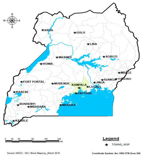 From 2002 to 2004, the NWSC in collaboration with the Water, Engineering and Development Centre (WEDC) and Makerere University piloted WSPs in Kampala and Jinja with funding from the UK Department for International Development (DFID) [7,9,25]. By 2009, 20 towns under the jurisdiction of the NWSC had developed WSPs [9]. The NWSC also received support from the International Water Association (IWA) that facilitated the creation of an 18-month Water Operators Partnership (WOP) between the NWSC Jinja Area (branch) in Uganda, Kisumu Water and Sewerage Company (KIWASCO) in Kenya and the Mwanza Urban Water and Sanitation Authority (MWAUWASA) in Tanzania. Through the WOP, whose key objective was restoration of the Lake Victoria catchment, benchmarking visits between the utilities were performed. Document reviews and external audit also took place [26]. WSP implementation support was also received from the German Agency for International Cooperation (GIZ), which sponsored a consultancy for a review of WSP implementation in three NWSC Areas, namely, Entebbe, Masaka and Mbarara [26]. In Water Supply Systems (WSSs) that are not under the jurisdiction of the NWSC, WSPs have been developed by Umbrella Organizations (UOs) with support from the Austria Government [26]. The UOs are associations of Water Supply and Sewerage Boards supervised by the Department of Urban Water Supply and Sewerage Services, Ministry of Water and Environment (MWE) in Uganda.