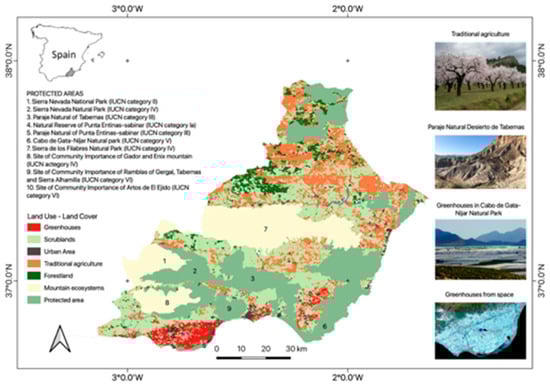 The challenge of biodiversity conservation not only describes the need for protecting one of the most unique habitats of Europe, i.e., the Spanish drylands, but also the urgent need to communicate to society the interdependent relationship between the maintenance of the greenhouse horticulture and conservation of local natural resources [32,34]. Although Almería greenhouses only occupies 4% of the province of Almeria, most are concentrated in the coastal platform where numerous habitats of priority interest are located [8]. For instance, in the southern part of the coastal platform called “El Campo de Dalias”, there are different Sites of Community Importance of the European Natura 2000 network, e.g., Paraje Natural of Punta Entinas-Sabinar (IUCN category III) and Natural Reserve of Punta Entinas-Sabinar (IUCN category Ia) (Figure 1), that protect priority habitats and species of community interest that contribute to maintenance of biodiversity (e.g., bird species) and ecosystem services (e.g., erosion control and aquifer recharge) [39]. However, major changes occurred in recent decades in the economic activities of the Almeria province have led to severe impacts on these habitats. Among these habitats are the community of Ziziphus (i.e., Priority Habitat 5220, Directive 92/43/ECC), one of the priority habitats for conservation in Europe that has almost disappeared [15,75] due to the expansion of greenhouse industry, urbanization and beach tourism.