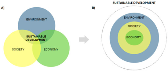 Conceptual framework of a sustainable agriculture model. Adapted from [42] (A) Three Pillars of Sustainable Development Model; (B) New Sustainable Development Conceptual Model.