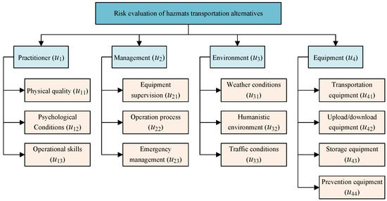 Step 1. Determine a set of decision criteria. In this study, the decision criteria are the four identified risk criteria (i.e., Human (), Management (), Environment () and Equipment ()) used to evaluate the transportation alternatives.