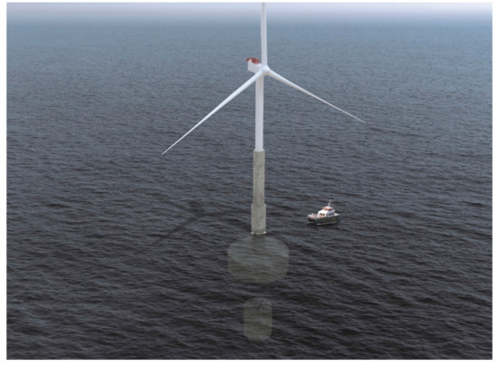 The floating offshore wind platform studied in this work is the Telewind®, an evolved concrete spar floating offshore wind platform designed by the Spanish enterprise Esteyco (see Figure 3). The offshore wind farm studied has a capacity of 500 MW.