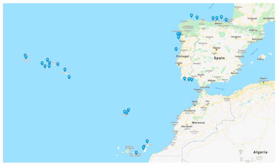In addition, the study analyzes thirteen locations in Spain (the Iberian Peninsula and the Canary Islands) and twenty in Portugal (the Iberian Peninsula, the Azores Islands, and the Madeira Islands).