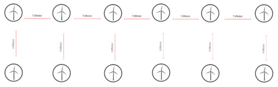 The distance between wind turbines is seven times the diameter of the rotor of the wind turbine and the distance between lines of wind turbines is nine times the diameter of the rotor of the wind turbine, as shown in Figure 7.