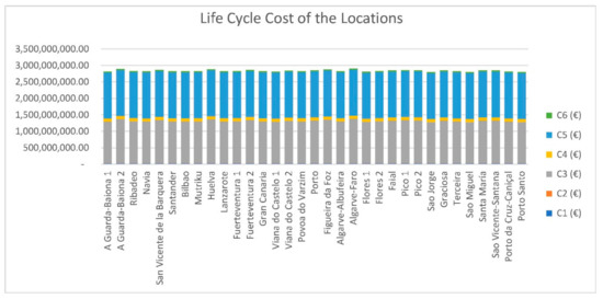 Figure 8 shows the life cycle costs of each proposed alternative. The most important phases of the life cycle of a floating offshore wind farm are the manufacturing cost and the operation and maintenance costs. The alternative with a lower life cycle cost is Sao Jorge, which is due to the strategic conditions of the location (1 km distance from shore).