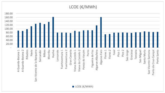 The LCOE comparison offers information on what might be the best locations for an offshore wind farm without taking into account the parameter of the electricity tariff, only the annual electricity production. As Figure 10 shows, Huelva (Spain) and Algarve-Faro (Portugal), have been the locations with the highest LCOE, exceeding 160 €/MWh.