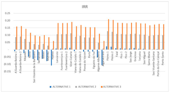 Figure 11 shows how the IRR increases when using a higher electricity tariff. Alternative 2 (e_rate = 100 €/MWh) implies an increase in the IRR by approximately 0.1 points with respect to the values obtained in Alternative 1 (e_rate = 50 €/MWh). Alternative 3 (e_rate = 150 €/MWh) implies an increase in the IRR by approximately 0.07 points with respect to the values obtained in Alternative 2 (e_rate = 100 €/MWh). Comparing these results with the opportunity cost considered in this study (4.92%), Alternative 1 does not offer viability to any location because the results of IRR are lower than 4.92% of the capital cost considered. Alternative 2 would be accepted in terms of IRR for almost all locations, except some in Spain: Santander, Bilbao, Huelva, Mutriku. Projects that consider Alternative 3 give a higher return than the minimum required for all locations.