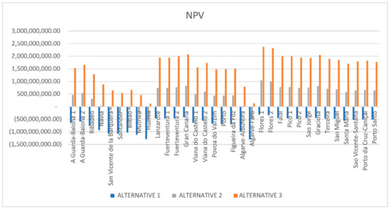 When a higher rate is considered for alternative 3 (e_rate = 150 €/MWh), NPV values increase significantly. All locations are positives now, and some of them exceed €2 billion, such as Gran Canaria (Canary Islands), Graciosa, Flores 1 and 2 (Azores).