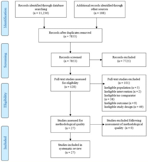 All identified citations were loaded into RefWorks 2.0 (ProQuest LLC, Ann Arbor, MI, USA), and duplicates removed. All studies identified in the database, book, and website searches for relevance based on the information in the title, descriptor terms, and abstract for published and grey literature were assessed. Two independent reviewers screened titles and abstracts and assessed full texts, with disagreements resolved by discussion or by consultation with a third reviewer. The study selection process is in Figure 1 for the published literature and in Supplementary Figure S1 for the grey literature. Of 7853 unique articles from the published literature, 7725 were not further assessed because of inappropriate study design or because they were not relevant to the review topic. After reading the full text, 101 studies of the previously screened 128 articles (78.9%) were excluded because they did not meet the inclusion criteria, resulting in 27 published studies for critical appraisal. Reasons for exclusion upon full-text read are in Supplementary Section S2. Nearly all (7914/7930 = 99.8%) of the grey literature articles focused on summaries of evidence, practice guidelines, pharmacotherapy and reports of the need for tobacco intervention education and these were excluded from this review. One unpublished study was selected for critical review, making a total of 28 articles for the critical appraisal process. The grey literature was an unproductive source of information for the review objectives. Reasons for exclusion upon full-text read are given in Supplementary Section S3.