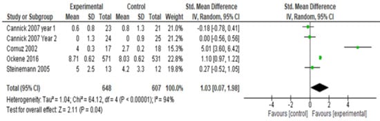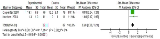 Two small studies [,] assessed whether students (n = 174) showed an increase in counseling skills for tobacco cessation following a motivational interviewing approach after instruction compared to control (Figure 5). The combined studies showed an overall increase in tobacco cessation counseling skills (SMD = 0.90, 95% CI 0.59, 1.21; p = 0.68, I2 0%); the overall group effect is significant (p < 0.00001). The I2 of 0% indicates that heterogeneity might not be important [].