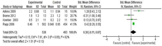 Four studies [,,,] assessed whether students (n = 1031) showed an increase in smoking cessation counseling self-efficacy after instruction compared to control (Figure 6). The combined studies showed an overall increase in smoking cessation counseling self-efficacy (SMD = 0.38, 95% CI −0.11, 0.87; p = 0.05, I2 62%). For these four studies, the group effect is non-significant at p = 0.13. The I2 statistic of 62% may represent considerable heterogeneity []. A sensitivity analysis was conducted “excluding” Rapp [] because of a high risk of attrition bias. The results with Rapp excluded show a small increase in I2 from 62% to 74%, and the overall group effect remains non-significant (p = 0.45). The results are similar and, therefore, can be considered robust.