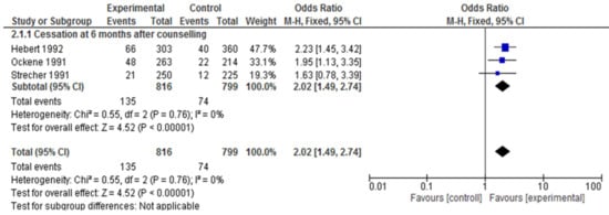 Three studies [,,] measured cessation by patients (n = 1615) at six months after counseling compared to control. The combined studies demonstrated an increase in cessation (OR 2.02; 95% CI 1.49, 2.74, p = 0.76, I2 = 0%) and the group effect was significant (p < 0.00001) (Figure 7). The I2 = 0% and p = 0.76 indicate that heterogeneity may not be important. We conducted a sensitivity analysis temporarily “excluding” Strecher [] because of high risk of attrition bias. I2 remains 0% and the test for overall effect remains strongly positive (p < 0.0001). The results are similar and, therefore, can be considered robust.