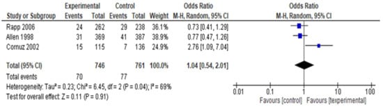 Three studies [,,] measured cessation (n = 1507) at 12 months after counseling compared to control and the combined studies demonstrated similar cessation rates between the treatment groups (OR 1.04; 95% CI 0.54, 2.01, p = 0.04, I2 = 69%). The overall group effect was not significant, p = 0.91 (Figure 8). Allen’s [] study assessed smoking status at three months and 12 months after study enrolment. Because of the difference in timing of the first measure (3 compared to 6 months), the Allen study was included with the studies measuring cessation at 12 months. The I2 = 69% may represent substantial heterogeneity. We conducted a sensitivity analysis temporarily excluding Rapp [] and Cornuz [] because of high risk of attrition bias. The Cornuz study was well executed and if Cornuz is temporarily deleted, the I2 decreases to 0% and the group effect remains non-significant (p = 0.14). When Rapp is excluded, I2 increases from 69% to 82% and the result remains non-significant (p = 0.62). Therefore, Cornuz is a source of heterogeneity.