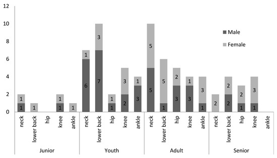 The most common injuries recorded were spasm/strain/tear at neck muscles (22%), muscle spasm/strain/tear at lower back (18%) and joint/ligament derangement at knee (16%), see Figure 2. Significant differences were observed between genders in lower back muscles incidence (Wald chi-square = 8.797, df = 1, p < 0.05) and between age-class in the knee (Wald chi-square = 8.565, df = 3, p < 0.05).