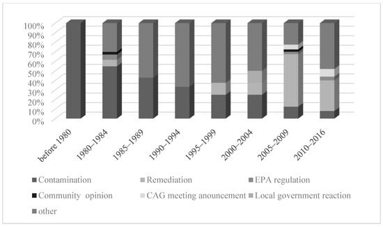 The themes changed over the years. Before 1994, contamination was the major and dominant theme for news articles (except during 1980–1984). Since 1995, the theme of remediation became salient, especially during 2005–2009 and 2010–2016 (Figure 4).