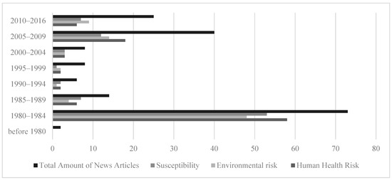 In terms of changes in the coverage of dioxin-related risk, the results showed that prior to 2010, newspapers focused on reporting human health risk more than environmental risk. After 2010, journalistic attention to environmental risk exceeded the attention to human health risk. The coverage about human susceptibility also changed over time, such that susceptibility was reported heavily during 1980–1984, then dropped until 2005–2009 (Figure 5). In general, the graphic results show a bi-modal distribution for reporting of human health and environmental risk and human susceptibility.