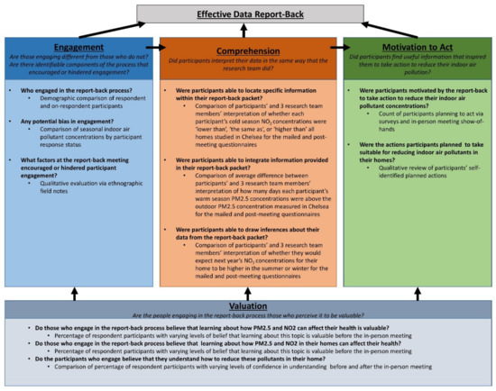 We implemented a concurrent triangulation mixed-methods evaluation of an air pollution data report-back to study participants in Chelsea, Massachusetts. We aimed to determine whether the report-back was effective in the following three ways: engagement, understandability, and actionability for the participants. We also evaluated participants’ valuation of the report-back information and process. The evaluation involved both qualitative components, such as ethnographic observation, and quantitative components, such as closed-ended questionnaires and demographic data. The participants who engaged in the report-back process were significantly different from those who did not engage both in terms of their demographics, and in their indoor air pollutant concentrations. Participant understanding generally corresponded with the intended meaning of the research team, suggesting successful data communication. Additionally, many of the participants reported that they were inspired to take action in order to reduce their indoor air pollutant exposure as a result of the report-back process and information provided. These results identify areas of improvement for engagement, particularly regarding populations that may have higher exposures. This work outlines a framework with which to contextualize and evaluate the success of engagement with report-back efforts. Such evaluations can allow research teams to assess whether they are providing information that is equitably useful and actionable for all participants.