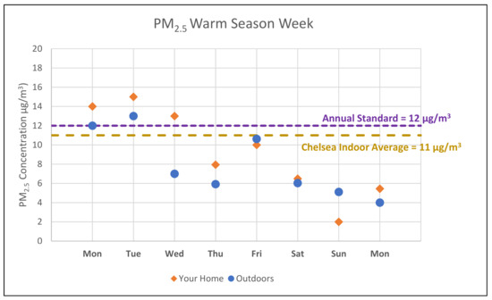 “Locating” was evaluated by asking participants to find a specific piece of information contained within their packet, namely: how their indoor concentrations of NO2 during the cold season related to the concentrations measured in Chelsea. “Integrating” was evaluated via a question asking participants to compare their average warm season PM2.5 concentrations to the outdoor concentrations measured relying on a graphical component (shown in Figure 3) of the report-back packet, and a second question asking participants to count how many days their cold season PM2.5 concentrations were above the EPA annual outdoor standard, also relying on a graphical component. Finally, participants were asked to “generate” information by identifying a data pattern within the packet, and noting whether they expected their NO2 concentrations to be higher in the summer or winter of the following year. All of the above question response options were Likert-style scales [22].