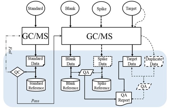The process of experimentally generating data and assessing quality and usability of data. Dashed lines indicate optional procedures. Samples include both QC (Quality Control) samples (Standard, Blank, Spike, and Duplicate) and Target samples. Samples are injected into GC–MS (Gas Chromatography–Mass Spectrometry) to generate the corresponding data. The overall workflow of QUICK (Quality and Usability Investigation and Control Kit) is illustrated in the grey box. Standard Data are compared with Standard Reference to generate QC report. Blank, Spike, Duplicate, and Target data are used to report QA (Quality Assessment) results.