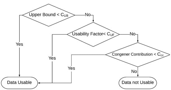 The flowchart for determining the usability of Target Data. , , and are sample upper bound objective, usability factor objective, and congener contribution objective, respectively.