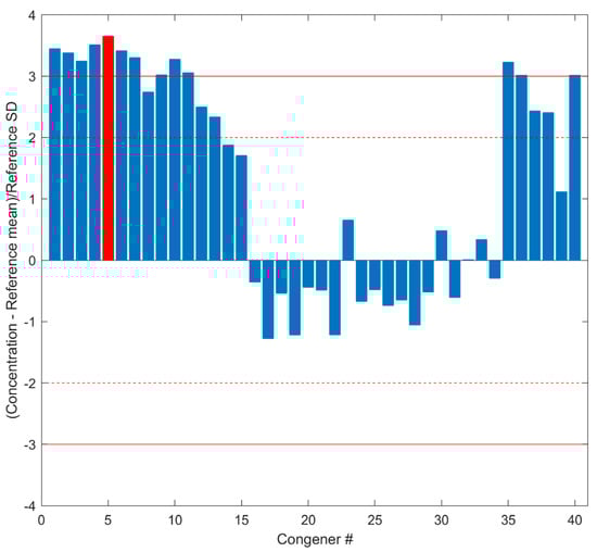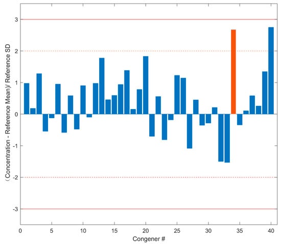 Concentrations of congeners in Spike Data. The differences in concentrations of the 40 congeners between Spike Data and corresponding mean concentrations in Spike Reference are transformed by standardization scaling to the standard deviations calculated from Spike Reference and are plotted at the y axis. The x axis indicates the congener numbers that are given in Supplementary Table S1. The dashed lines give the region within two standard deviations, and the solid lines depict the region within three standard deviations. The red bar represents the scaled concentration of congener 1234789-HpCDF.