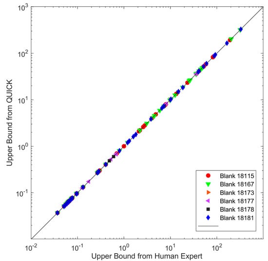 Comparison between the upper bound from QUICK (y axis) and upper bound from the human expert (x axis) for congeners of six Blank Data sets (solid red circles: data from Blank 18115; solid green down triangles: data from Blank 18167; solid orange right triangles: data from Blank 18173; solid purple left triangles: data from Blank 18177; solid black squares: data from Blank 18178, solid blue diamonds: data from Blank 18181). If a data point is on the diagonal line, the concentrations from QUICK and the human expert are the same for the congener.