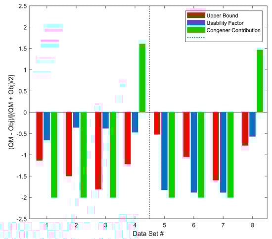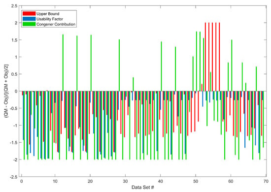 Difference between quality metrics and their objectives for upper bound (red bars), usability factor (blue bars), and congener contribution (green bars) are shown on the y axis for the 69 Target Data sets. The x axis gives the order of the 69 Target Data sets. For the same dataset, if all three bars are above zero, the dataset is not usable; otherwise, it is assessed as usable. #: Data Set.