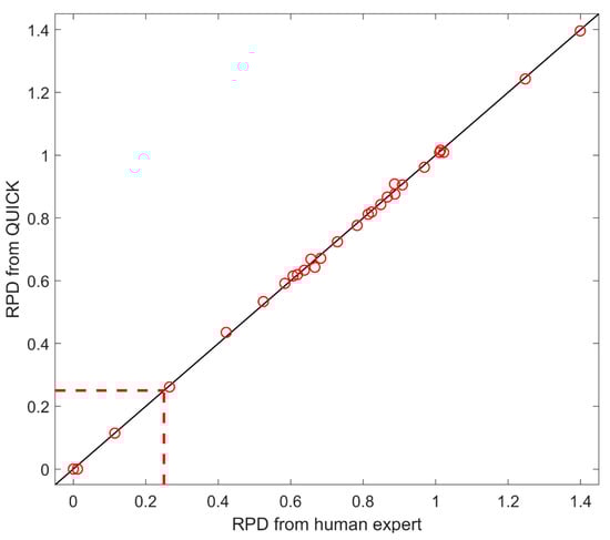 Comparison of relative percent difference (RPD) between human expert (x axis) and QUICK (y axis) for different congeners. Each circle represents a congener. If a circle is located on the solid diagonal line, the congener has the same RPD from QUICK and the human expert. The dashed lines represent the threshold at 0.25 and divide the plot into two regions. The bottom left region has 17 congeners that meet the criterion of RPD < 0.5, while the upper right region contains 25 congners that do not meet the criterion.
