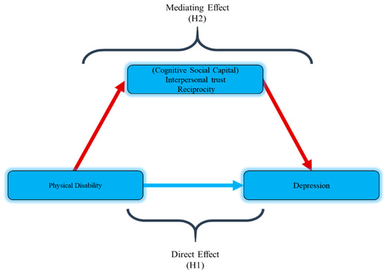 Thus, the present study hypothesized that physical disability (ADL and IADL) is associated with higher depression (H1). This study also hypothesized that cognitive social capital (interpersonal trust, reciprocity) could mediate the relationship between physical disability and depression (H2) among the rural elderly of Pakistan. Figure 1 shows the hypothetical model.