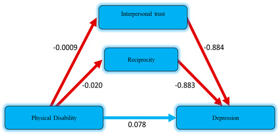 The input or influence of physical disability and cognitive social capital on depression was determined by conducting multiple linear analysis. The mediating effect analysis was conducted via PROCESS model-4 [40], which can be operated through SPSS and other available statistical software packages. In this analysis, the mediation effect of two dimensions of cognitive social capital (interpersonal trust and reciprocity) on depression as an outcome variable was discovered through bootstrapping technique.