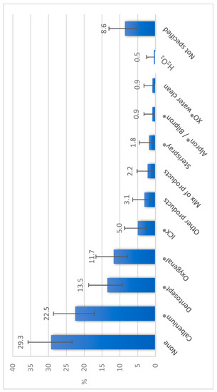 Products used for the chemical treatment of water in the 223 dental care units studied in Eastern France in 2016. Note: Calbenium® contains quaternary ammonium, EDTA, and sodium tosylchloramide; Dentosept®, Oxygenal®, and XO® water cleaners are made of H2O2; ICX® contains sodium percarbonate, silver nitrate, and cationic surfactants; Sterispray® contains benzalkonium chloride, chloramine T, and EDTA; Alpron®/Bilpron® contain EDTA and polyaminopropyl biguanide with sodium tosylchloramide for Alpron® and with ester p-hydroxybenzoate for Bilpron®.