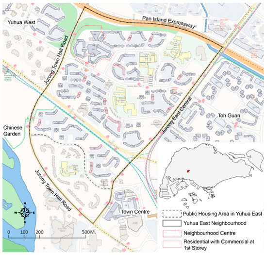 The Yuhua East neighborhood is located in the town of Jurong East, in the west region of Singapore (Figure 1). It is a typical example of HDB new town developments in late 1970s and 1980s, following “New Town Structural Model” with amenities planned at three hierarchies from a town center, to neighborhood centers, and then precinct centers (see [17] for details about HDB new towns). Defined by administrative boundaries, Yuhua East covers a 93-hectare area of land with a population of 26,330, where 17.8% of the residents are aged 65 years old and over and 34.8% are 55 years old and over [16]. Yuhua East is bounded by the Pan Island Expressway, Jurong Town Hall Road, and Jurong East Central. The Yuhua West and Toh Guan neighborhoods are located to its west and east, respectively. A 13-hectare park named Chinese Garden is located to its southwest, and the town center with shopping malls, Jurong Regional Library, and the bus interchange are located to its southeast. Housing type is a key symbol of social-economic status in Singapore. In Yuhua East, 88.5% of the residents live in public housing estates, with 37.3% living in three-room flats, 30.6% live in four-room flats, and 32.1% live in five-room and executive flats [16]. The residents here are 73.4% Chinese, followed by 13.6% Malay, 10.9% Indian, and 2% other. Though data are not available for Yuhua East, among those aged 55 years old and over, the proportion of Chinese is higher at 80.9% [16]. This article focuses on the public housing area within Yuhua East.