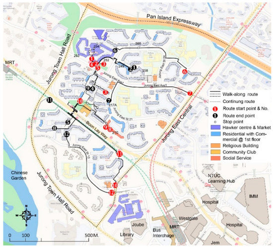 Walk-along interviews were carried out from August to September 2018 by one researcher using purposeful convenience sampling. The researcher’s mother language is Mandarin Chinese, with Test of English as a Foreign Language® (TOEFL®) test score of 106. Though older adults are generally defined as those above 65 years and over, this study included those aged 55–64 because that Singapore is ageing rapidly and their opinions are valuable for future developments. The percentage of participants aged 55–64 was expected to be less than 20%. Selected samples were also expected to cover similar numbers of male and female, including Chinese, Malay, Indian, and other. To be recruited, participants needed to be able to speak either English or Mandarin Chinese, living in Yuhua East, or living in the nearby neighborhood but walking to the facilities in Yuhua East on a daily or weekly basis. Interviews were recorded and transcribed for analysis if the participant agreed. Otherwise, the researcher jotted down key phrases and facts on the spot and expanded them into full sets of field notes as soon as possible after the interview. During the walk, the researcher also took photographs of the things mentioned. The routes were hand drawn on printed maps, compiled, and digitalized later. The starting/ending points on the digital map were adjusted to the surroundings to protect the participants’ information. The study protocol was approved by the IRB of the university (S-18-155E).