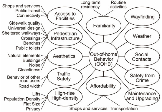 Categories and sub-categories of neighborhood environmental factors influencing older adults’ out-of-home behaviors (OOHBs).