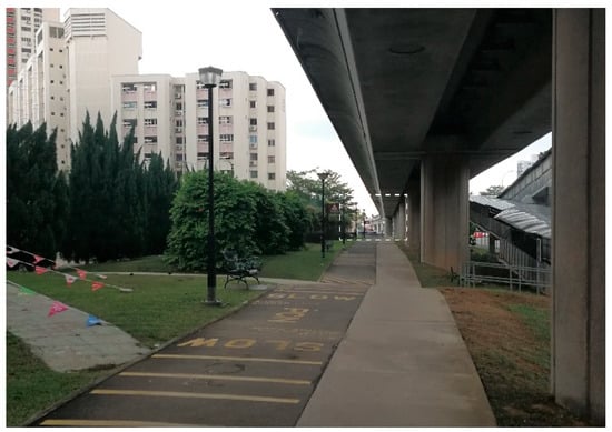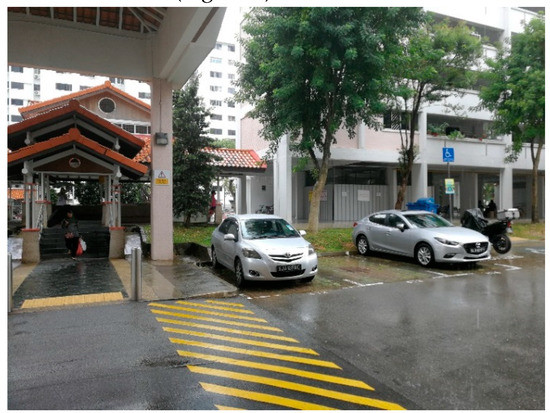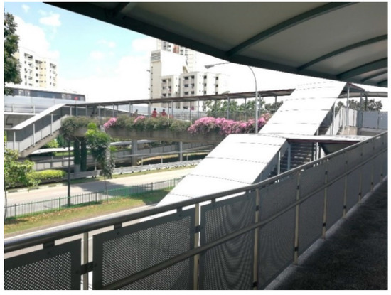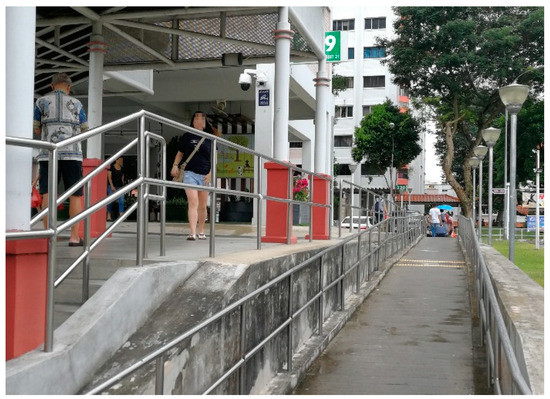 Singapore has a typical tropical climate with high and uniform temperatures and with high humidity all year round. Many participants (n = 9) mentioned that hot weather or rain influences OOHBs, especially for recreational activities. The participants expressed that they avoid going out in the early afternoon and prefer to do just a little exercise if the weather is nice. For the participants who have jobs, join fixed-time activities, or need to buy necessities, they go out regardless of the weather conditions. In this case, sheltered walkways play an important role in encouraging older adults to go out. Sheltered walkways with slopes are necessary for wheelchair users’ OOHBs because the caregivers may not have free hands to hold the umbrellas for them (Figure 11). Additionally, older adults need to be careful when they go out in the hot weather. A participant in his 80s shared his dangerous experience during a follow-up informal interview: