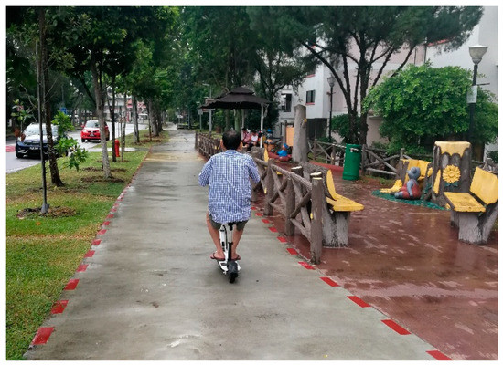 Some participants (n = 4) expressed their concerns regarding traffic safety on the sidewalks and roads. As older adults may need extra green man time to cross the road, the participants mentioned that some drivers do take notice and slow down while others pay no attention. Regarding sidewalks, the participants expressed safety concerns related to the behavior of other road users, cyclists and those on personal mobility devices. A participant said: “Be careful. Sometimes, there are people who ride on scooters or bicycles. Need to be careful (and) walk on one side (Figure 10).” One male participant goes out for his walking exercise as early as 6:30 am to avoid the traffic and he said: “At 6:30, there is little traffic. The most horrible ones are those on e-scooters. They come near to you without making any sound. If they knock you down, they (would) just say I have no money to compensate you.”