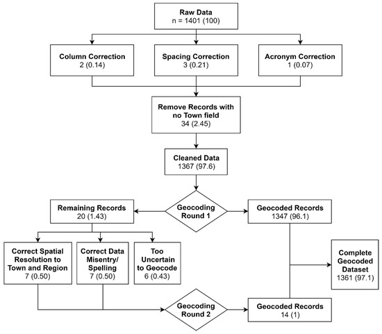 Over 1900 laboratory-confirmed records of cholera between 1992 and 2014 were abstracted from stored logbooks (1992–2004) and electronic databases (2004–2014) maintained by the Department of Microbiology at CMC [21]. Approvals for data use and analysis were obtained from the CMC Institutional Review Board and by the Tufts Institutional Review Board. A laboratory definitive isolation of V. cholerae O1, O139, or non-agglutinating serotypes was used as the case definition for cholera. Continuous information was available for 15 years (1 January 2000–31 December 2014; 5479 days) and included 1401 records. Each record included the following fields for each patient: Date of Hospitalization, Town, State/Region, Age, Sex, and Serotype, which we used to create a cluster population profile. We standardized the Date of Hospitalization to a year-month-day format and removed 31 records with missing Town or Region from the dataset. The Town and Region fields were also standardized to reflect the most recent spelling of each place and were geocoded using the ggmap [22] R package. This automated geocoding process provided a latitude and longitude corresponding to the centroid of the town extent reported by each cholera patient as their PoR. Cases that could not be geocoded in the first round were flagged and examined for spelling errors. The Town and Region information was corrected for obvious typos, and for ambiguous entries, the nearest Town and State name was found from Google Maps. After corrections, a second round of geocoding was implemented. Overall, 1366 (97.5%) of records were successfully geocoded. A flowchart of the two-step geocoding process is shown in Figure 2, and a map of the geocoded records is provided in Figure 3. R Version 3.5.1 [23] and RStudio Version 1.1.463 [24] software were used for all data processing and statistical analyses.