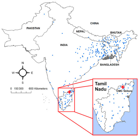Map of cholera patients’ places of residence as observed at Christian Medical College (CMC) hospital in Vellore, Tamil Nadu state, India.