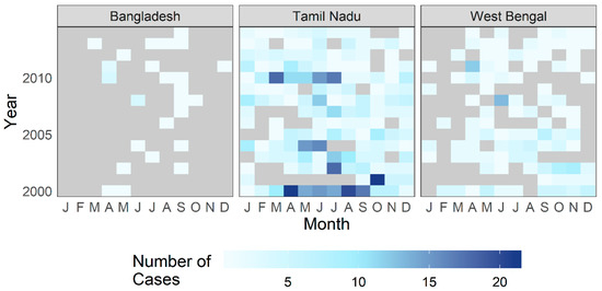 Number of patients treated for cholera at CMC Vellore by year and month from the country of Bangladesh and the Indian states of Tamil Nadu and West Bengal.