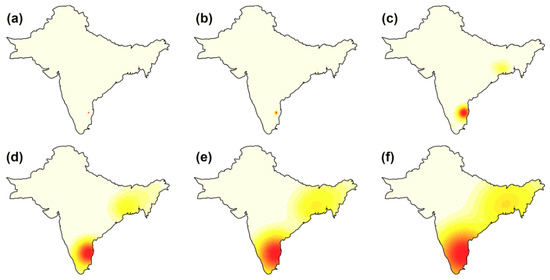 Cholera case intensity, or the number of cases per unit area, was examined to investigate whether the observed clusters are consistent. As seen in Figure 6, Vellore consistently appears to be an important cluster for all smoothing kernel values. The extent of this cluster increases with increasing kernel size. As the magnitude of adjusted bandwidths increases, a region of moderately high case intensity is also observed in the Eastern portion of the study extent, spanning Bangladesh and eastern Indian states (Figure 6c–f). The cross-validated bandwidth intensity maps (Figure 6a,b) display a very narrow radius of case intensity around Vellore, indicating that the large percentage of cases from Vellore may mask lower case intensities from other regions.