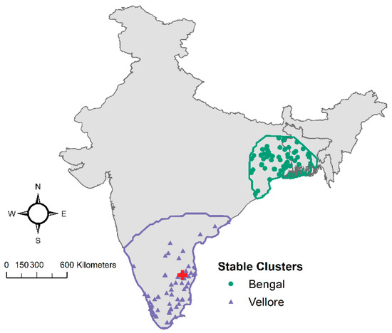 A set of 14 models representing several families of spatial trends were investigated to describe this dataset (Table 2). The three models with the lowest AIC identified two clusters—one around Vellore with 836–841 cases, and one in Bengal with 294–493 cases (Figure 7). Cases consistently classified as belonging to one cluster across all three models were designated as stable clusters. Thus, the stable Vellore cluster had 836 cases (61.2% of the geocoded dataset), the stable Bengal cluster had 294 cases (21.5% of the geocoded dataset), and 326 cases were not part of either cluster (17.3% of the geocoded dataset). The Vellore cluster has a large average radius of approximately 306 km, indicating that CMC Vellore hospital has a large local capture area around Tamil Nadu, Andhra Pradesh, and Kerala states. The stable Bengal cluster has a small average radius of approximately 194 km located much farther away from CMC Vellore (Figure 7).