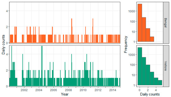 In Figure 8, time series of counts show the temporal dynamics of cholera cases for the two stable clusters, and the histograms reflect the distributional shape of the temporal process. The first bar of the histograms indicates a high proportion of days with no cholera cases (88% for Vellore and 95% for Bengal). The time series plots show that both clusters have prolonged periods with no cases and occasional spikes of higher counts.