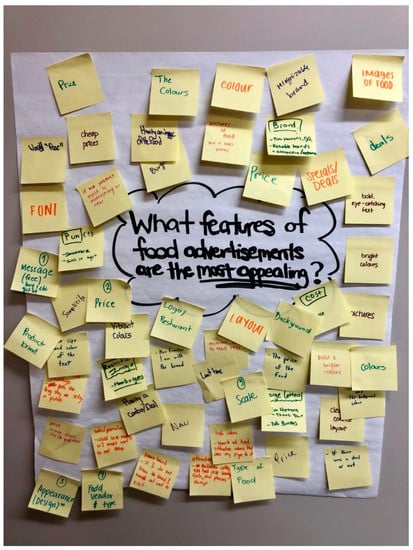 A collaborative participatory approach was used to uncover teen perceptions of food and beverage advertising influences to be able to conceptualize the power of marketing techniques [61,62]. The council worked with the primary author during multiple council meetings (held from October 2018 to March 2019) to develop a validated, teen-informed coding tool that could be used to measure the information environment. During the first few meetings, the youth were introduced to the tool-development project and discussions were held to better understand the information environment’s impact on teens. Through the collaboration process, they explored a variety of food and beverage advertisements that were collected in the audit to uncover teens’ perceptions of food advertising. The youth engaged in a variety of structured discussions and activities aimed at identifying which features of food advertisements are most important at capturing their attention and drawing them inside food vendors. The council members were provided with an initial list of existing coding criteria (e.g., health appeal, novelty, humour) derived from literature to review and discuss features perceived to be important from a teen perspective, and to establish criteria they felt were missing from previous coding techniques [36,39,55,63]. The qualitative discussions with the YAC were recorded with handwritten notes (i.e., meeting minutes).