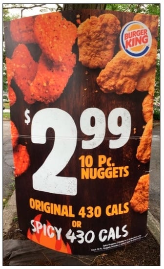 Researchers have highlighted the scarce evidence involving adolescents’ exposure to outdoor food and beverage advertisements [19,44,45,46]. Many of the studies that do explore this exposure simply examine general geographic factors, like the pervasiveness and distribution of food advertisements within communities and across neighbourhood types [43,44,47,48,49]. While coding schemes to classify various child-directed advertising criteria have been developed [36,45,50,51], most studies simply coded for the presence or absence of each criterion [19,31,36,50,51]. Further, such coding schemes applied predetermined criteria instead of consulting target populations to determine what factors are important to them; this tailoring of criteria is important to fully understand how advertising influences specific populations of interest [23,30]. To date, researchers have not yet considered the relative influence of each criterion on teens’ perceived purchasing behaviours. This is an important gap, given that some features could be more conducive to teen food purchasing than others.