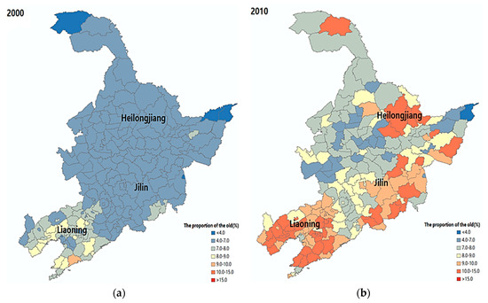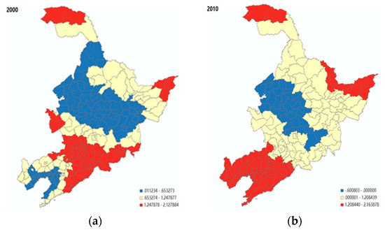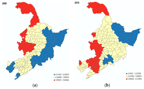 The main goal of this section is to evaluate the spatial impact of ageing in the northeast region. It is informative to outline the overall level of the aged population before considering its variation and the relationship with other socio-economic factors over time. Therefore, Figure 2 depicts the regional distribution of the aged population in the reference years of 2000 and 2010. Here, each pixel location i is given different colors according to its proportion of aged population over a total local population. By looking at Figure 2a, there is an indication that the share of the aged population significantly increased for many regions of northeast China over the period 2000–2010. In 2000, the proportion of the aged population in most regions of Heilongjiang and Jilin was only inside a range of 4–7%. In comparison, Liaoning province had a higher level of population ageing, as approximately 7–9% population was equal or greater than age 65. However, a quite different pattern can be captured in 2010. Figure 2b shows that in the most populated and developed regions of all three provinces, the proportion of aged population had significantly increased to 9–15%. These findings reveal that the population structure of the entire northeast region has undergone a dramatic ageing process in recent decades, particularly in large cities such as Shenyang, Dalian, and Harbin.