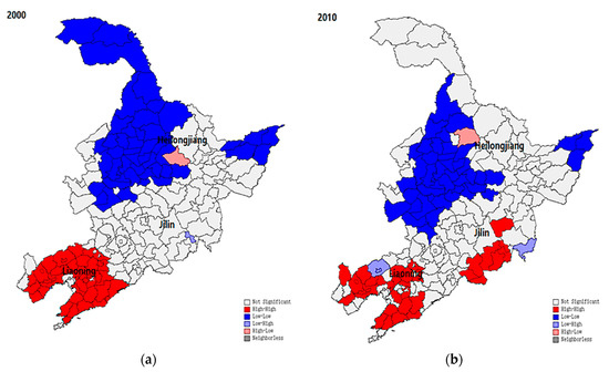 Next, as described above, the global Moran statistics (GMS) and local Moran statistics (LMS) are adopted with different perspectives to deliver robust results. The values of GMS were 0.72 and 0.54 in 2000 and 2010, respectively; all reached the level of significance. This finding hints that in general, the spatial autocorrelation effect of population ageing was observed. The LMS analysis further reveals a significant variation of such an effect among different regions. As shown in Figure 3a,b, a clear clustering pattern of population ageing, no matter if the feature is ‘HH’ or ‘LL’, can be observed. In 2000, the ‘LL’ cities, where the proportion of ageing population is lower than that of the regional average (i.e., the zone with a comparatively slower ageing process), mainly concentrated in Heilongjiang province, whereas the ‘HH’ cities, where the proportion of ageing population is higher than that of the regional average (i.e., the zone with a comparatively faster ageing process), can be only observed in Liaoning province. In comparison, the size of the ‘LL’ region significantly decreased, and in addition to the existing ‘HH’ region in Liaoning, a number of cities in Jilin also exhibited a trend of clustering in 2010. These findings may prove the interdependency between population and urbanization. As the economic and political center of the northeast region, Liaoning province provides the highest supply of jobs in the heavy and manufacturing industries, while other regions such as Heilongjiang only have a limited effect. Therefore, it is not surprising to see that the ageing process was faster in the populated area. However, the ageing situation has drastically changed within one decade. Now, even the traditionally less populated areas with a lower level of economic development also experienced an increase in ageing population.