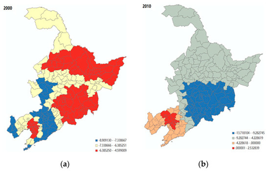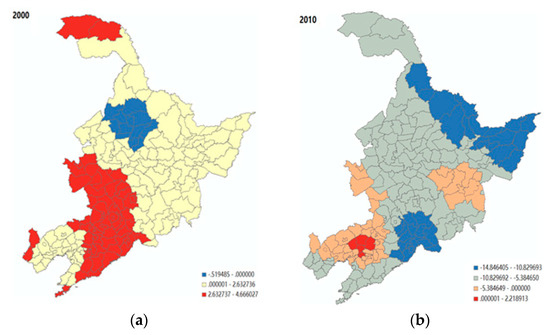 LMS index of the cities in northeast China. (a) Year 2000; (b) Year 2010.