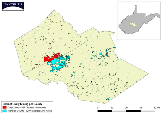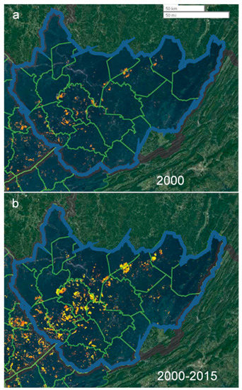 Yearly SkyTruth data for each county included (1) the number of distinct active mining sites; (2) the total square kilometers (km2) of active acres mined for that year, both of which were based on the unique spectral characteristics of vegetated forest vs. non-vegetated land; and (3) the cumulative km2 mined for that county. Active mining was defined as “any land where mining activity (i.e., earth removal and replacement) was likely occurring, or where mining activities had recently ceased so that the landscape still resembled a mine in active development”. Any individual Landsat image PIXEL (picture element) had to be classified as a mine site for all 365 days of a particular year to be counted as a mine for that year. Sites identified as an active mine in one year, would not be added again to the cumulative mining area total in future years such that “cumulative mining” was defined as “the non-duplicative summation of active mine area over time”. “Distinct likely mining sites” (Figure 2) were defined as “discrete areas of detection”. When a distinct site overlapped county boundaries, it was counted as a distinct site in each county. It should be noted that such distinct sites, as determined by satellite imagery, do not necessarily correspond to WV state, or mining company, mine boundary designations. It should also be noted that these methods do not distinguish between smaller surface mines vs. larger operations typically designated as “mountaintop removal mining”. However, as discussed in Pericak et al. [39], Appalachian coal is increasingly difficult to extract and now requires a greater area of active mining to obtain a metric ton of coal. Three times more area of mountainside per metric ton of coal was mined in 2015 vs. that required in the early 1990s [39]. Thus, the mining activity documented in our 2000–2015 time frame was increasingly likely to be classified as the mountaintop removal mining type, and no further efforts were made to differentiate between the two types of surface mining here.