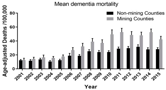 A negative binomial regression with a log link function was used to compare the relative trajectories of the increases in vascular and unspecified dementia mortality in mining vs. non-mining counties. The interaction between year and mining counties was significant (p = 0.007). On a year by year basis, the rate of dementia mortality increased 12.7% each year in mining counties compared to 8.9% in non-mining counties. The Incident Rate Ratio for this interaction is 1.035, indicating that for every 1 year increase in time, the rate of dementia mortality in mining counties increases 3.5% (95% C.I.: 1.0%–6.2%) more in mining counties than the rate of dementia mortality in non-mining counties.