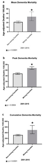 Mean, peak and cumulative age-adjusted vascular and unspecified dementia mortalities/100,000 population in non-mining vs. mining WV counties over the years spanning 2000–2015. All p-values are two-tailed. (a) The median mean dementia mortality in mining vs. non-mining counties in West Virginia. A Mann–Whitney U test for non-parametric distributions showed this measure was significantly higher in the mining counties (U = 119). The (median) mean deaths per year from dementia for mining vs. non-mining counties over the 15 year span was respectively 33.07 vs. 21.41 age-adjusted deaths per 100,000 population (Each plotted with a 95% C.I.: ±5.71, ±18.75). * denotes significantly different from non-mining counties, p < 0.0001). (b) Mean peak dementia mortality in mining vs. non-mining counties in West Virginia over the years spanning 2000–2015. An unpaired t-test found significantly higher peak dementia mortality in the mining counties (t = 3.77; df = 52; p = 0.0004). Mining counties had a mean (±SEM) peak value of 67.5 ± 4.81 age-adjusted deaths per 100,000 populations vs. 47.83 ± 2.82 for the non-mining counties. * denotes significantly different from non-mining counties; p = 0.0004). (c) As for cumulative dementia, a Mann–Whitney U test (again these data were non-parametric) showed significantly higher cumulative dementia mortality in MTM counties (4C; U = 121; p < 0.0001). The median cumulative death rates from dementia were 496 vs. 318 per 100,000 (Each plotted with a 95% C.I.: ±87.5, ±279.7).