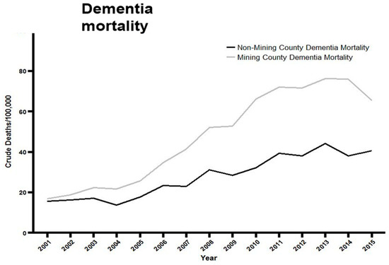 To summarize the main findings, a highly significant increase in the age-adjusted vascular or unspecified dementia mortality/100,000 population was found in West Virginian counties where MTM occurred from 2001–2015, relative to that of non-MTM counties over the same period. The mean, peak and cumulative rates of dementia across the 19 counties were all significantly elevated in MTM-counties. Of particular import, there was a strong correlation between the number of distinct mining sites per county vs. the rate of dementia mortality for that county, in contrast to the marginally non-significant association found between the actual km2 mined vs. the rate of dementia mortality. In addition, we saw a significant increase in the rates of both unspecified and Alzheimer’s dementia mortality over these 15 years in both MTM and non-MTM counties. This is consistent with reports of elevated all-type dementia and neurological diseases in the U.S., other industrialized countries and the developing world over this period [40,41].